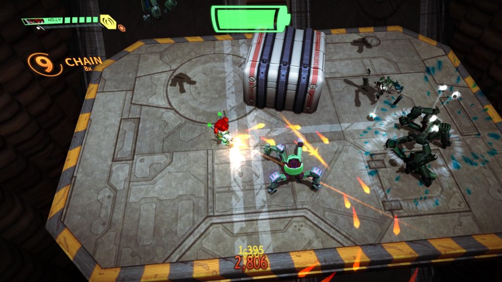 If you’re a high score chaser, Assault Android Cactus has you covered. Trying for the highest possible score in each level should keep you coming back for a while and it will come down to practice and memorization. You want to avoid the projectiles and mobs of foes coming from multiple directions so you’ll always need to be alert and aware of your surroundings. Killing enemies in succession results in a score multiplier chain and you obviously want to get the chain as high as possible and not lose it. While enemies and bosses can’t outright kill you, they can knock you down and that will result in time lost. In other words, it doesn’t stop the battery from draining. Being knocked down is time not spent shooting and killing enemies. Get knocked down enough and that time lost adds up. The battery mechanic basically adds a form of pressure to the gameplay and requires you to always keep moving and shooting. You need to kill enemies so they can drop the Battery Recharge so you can keep going.