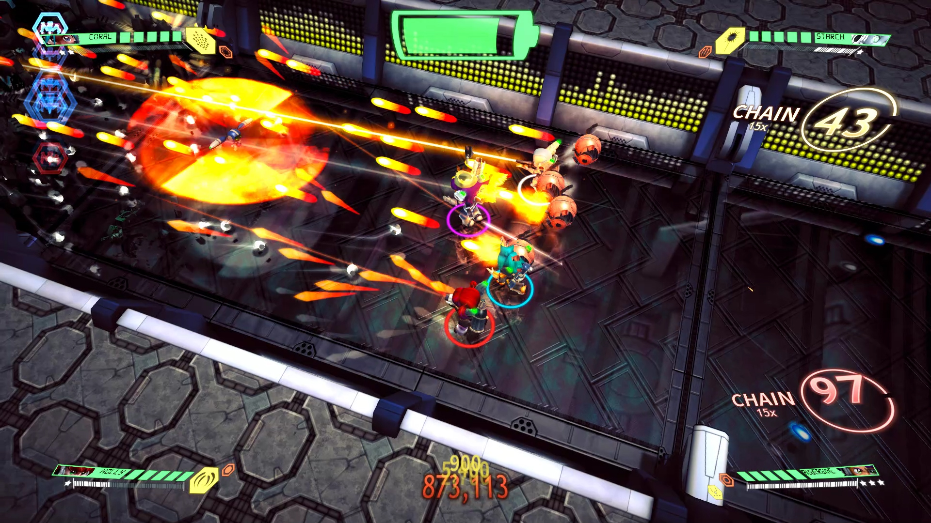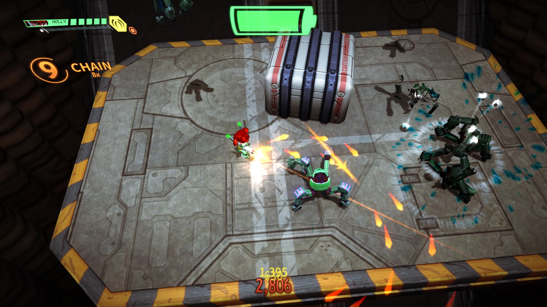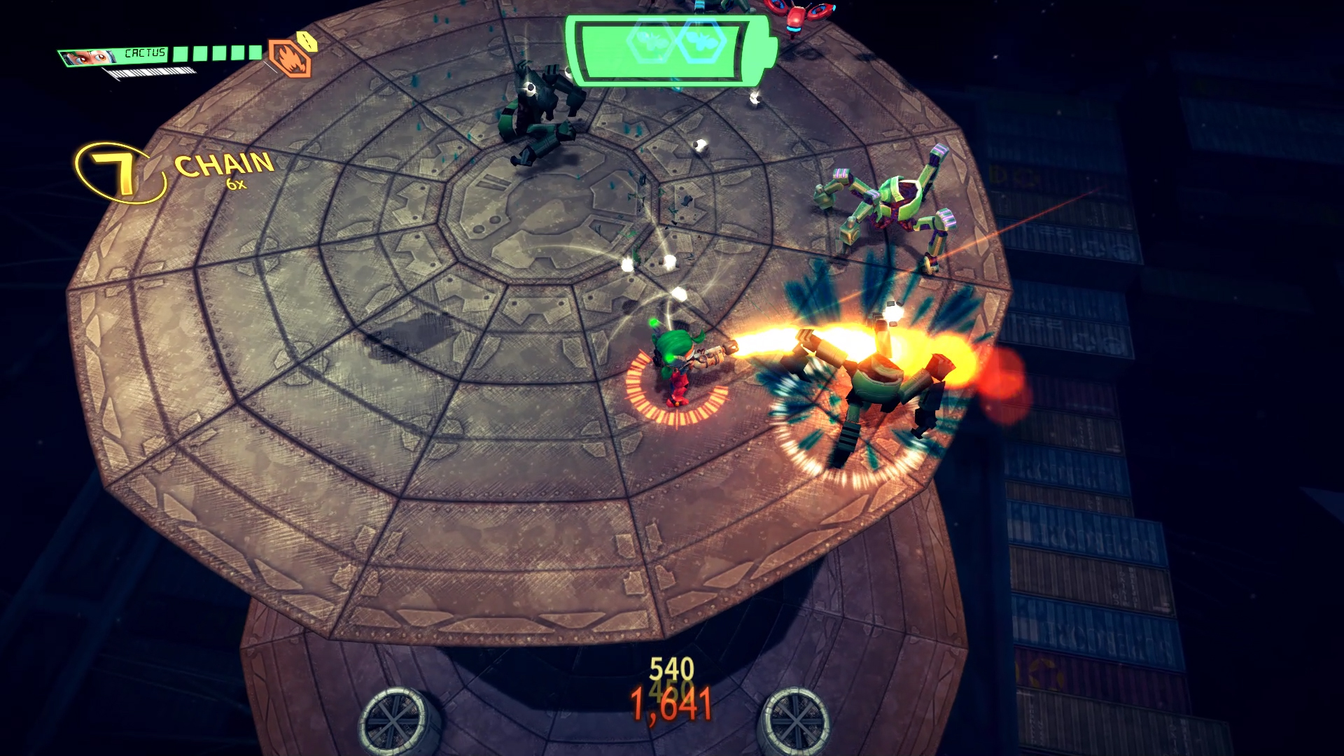 One of Assault Android Cactus’ highlights is the gameplay and it does support cooperative play with up to four players. The difficulty ramps up nicely as you progress through the campaign and some levels can be extremely challenging. And the Campaign+ mode will really test your skills. The gameplay can become very fast-paced and hectic and victory and high scores will require practice and quick reflexes. The android’s primary weapon comes with infinite ammo and their secondary weapon has a cooldown period. Defeated enemies will drop energy that can be picked up to power up their primary weapon. If an android’s shield is depleted, they will be knocked down but they don’t actually fail or die unless the battery drains completely. They run on a battery that drains at a fixed rate and I see this as a kind of timer mechanic, basically. However, enemies will drop Battery Recharge pickups so it’s important to keep an eye out for these. Other pickups include temporary bonuses like friendly machinegun drones, increased speed, and one that disables enemies.
