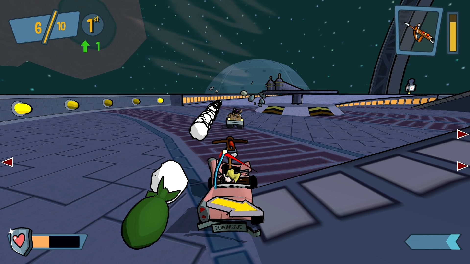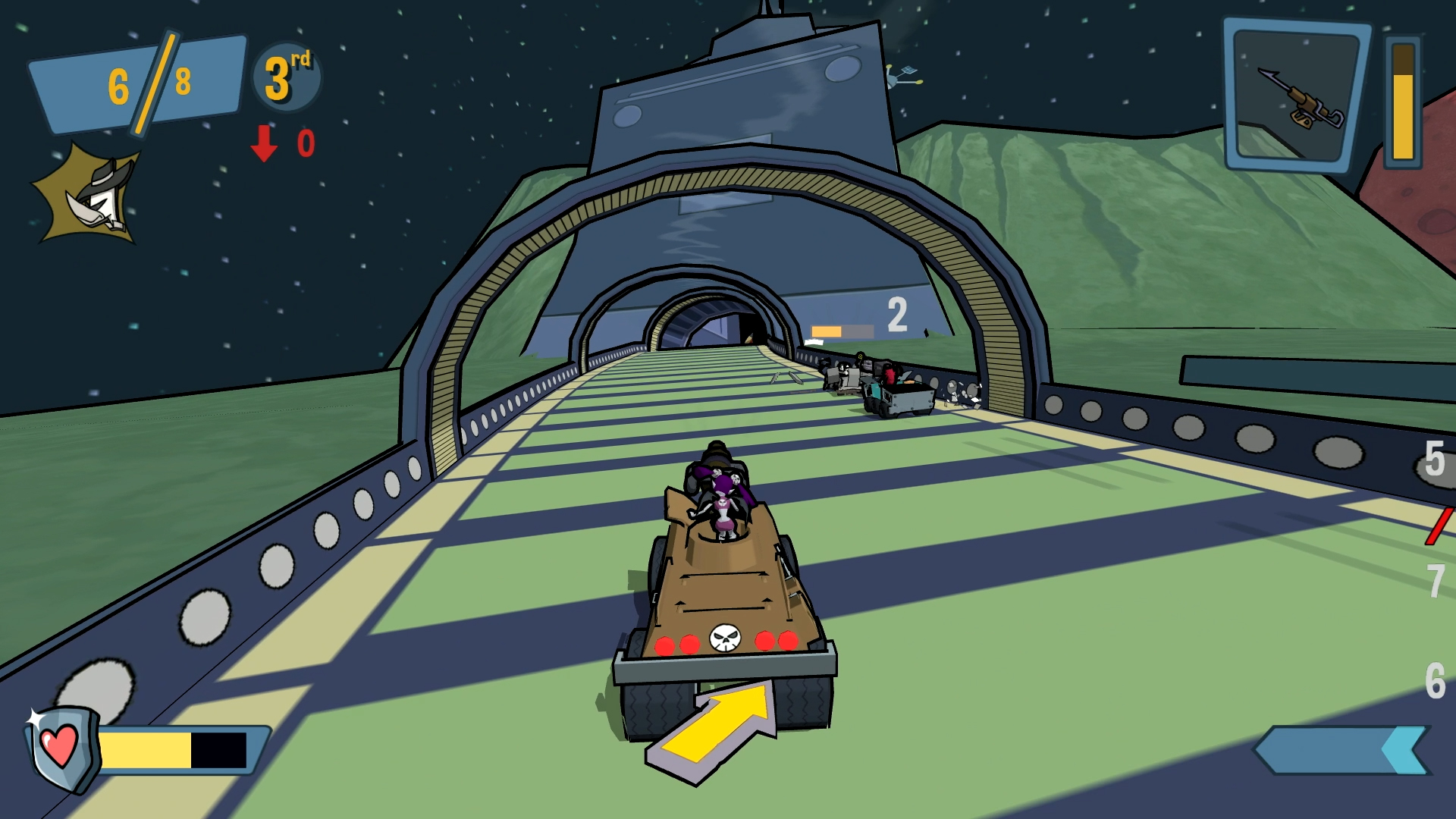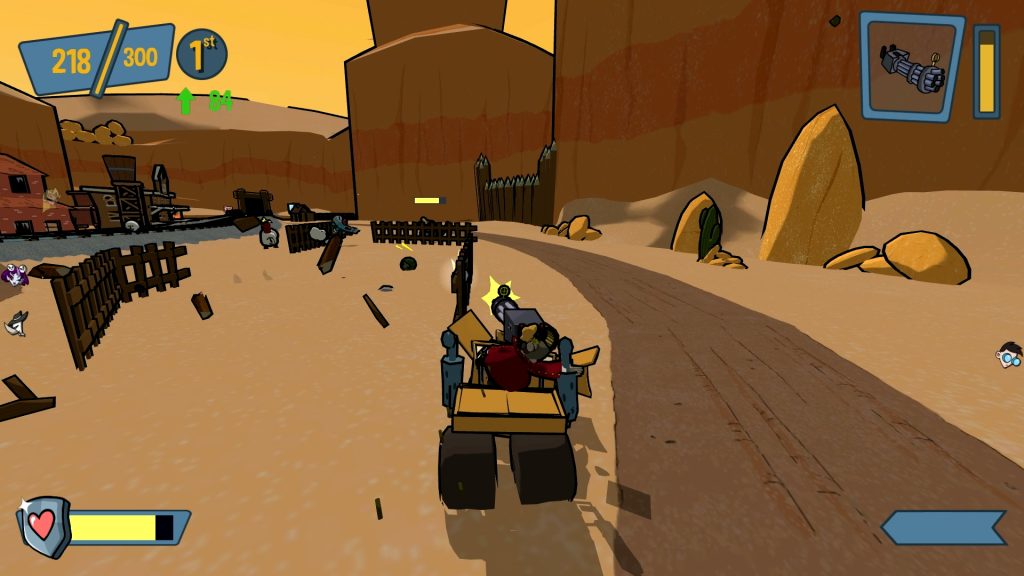 Unfortunately, the cel shading is all the game really has going for it. Outside of the cartoon concept, there’s nothing here that we haven’t seen before in the genre and if you strip away the cartoony presentation, it’s a pretty standard vehicular combat game. You can accelerate, brake, powerslide, and dodge in different directions. The vehicles control well enough and I like the cartoony physics but sometimes I felt they were a little too floaty for my liking. Each toon comes with their own weapon but a variety of others will spawn in the arenas ranging from melee weapons like bats and axes to projectile weapons like guns and lasers. You can lob grenades, lay down bombs, swing around a chainsaw, and even turn your vehicle into a gunship. Overall, the weapons are cool but some are definitely better than others and in the modes other than Gate Relay, I sometimes found that I was spending more time driving around simply trying to find and collect the best weapons for the job. Once unlocked, weapons can be toggled on or off before jumping into a match.