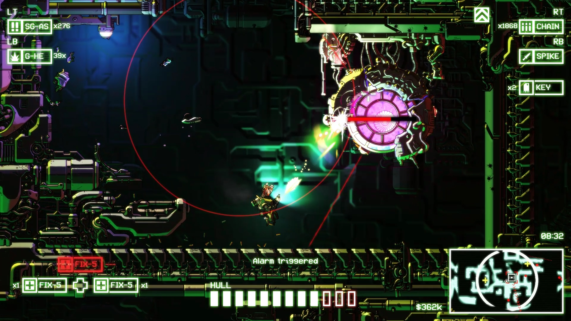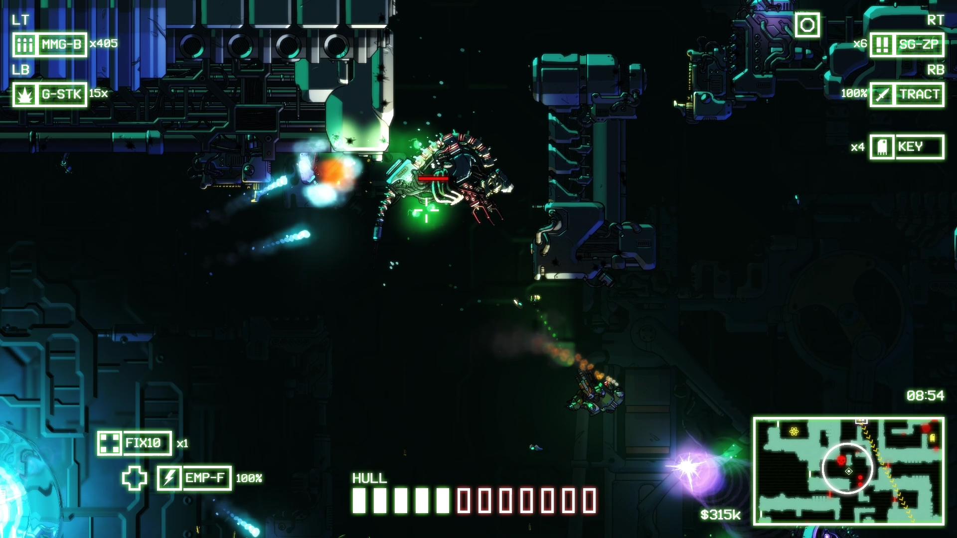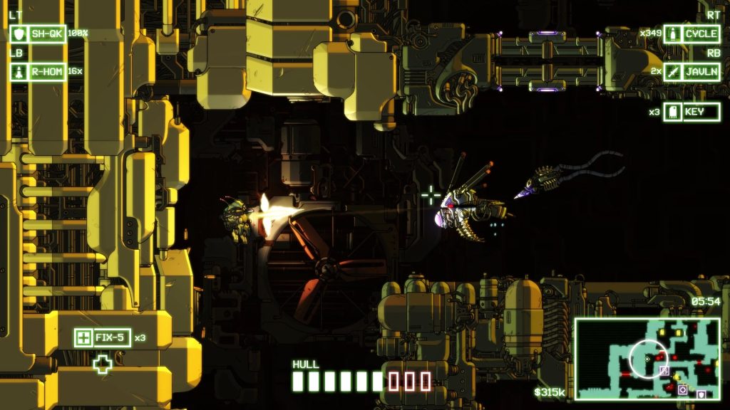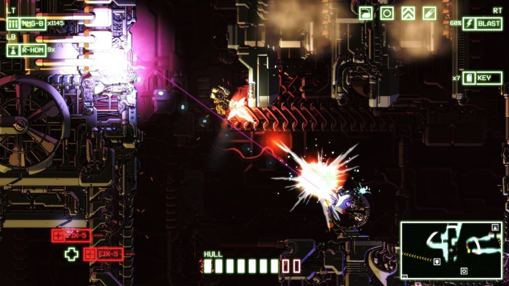 The ship layouts are randomly generated. This means no playthrough will ever be exactly the same and it does add some replay value. The campaign isn’t very long but it can be tough. You fly around the ships, shooting at enemies and you’ll typically be outnumbered. It’s not uncommon to get overwhelmed by foes and projectiles and you have to be mindful of things like turrets and hazards. You also need to be mindful of resources like ammo and your hull or health. Luckily, there are pods on the ships that can resupply you with ammo and replenish health for a fee. You can also equip items that help you with these things. As you move around the ships, you want to be on the lookout for keycode and tech terminals. Keycode terminals grant you key codes to unlock doors. Interacting with tech terminals grants you new tech which equates to new weapons and items to equip your character with. There are all kinds of weapons available from more traditional firepower to energy weapons and more, and I found the combat in the game to be punchy and satisfying. Weapons fire looks, feels, and sounds good thanks to cool visual effects and solid audio work. The action can be fast-paced, hectic, and challenging.
