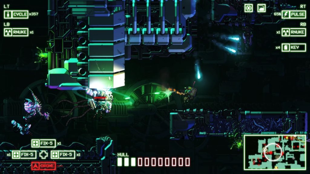 I think CRYPTARK is a pretty good looking 2D shooter. It’s got a dark sci-fi look and feel and the visual effects really help elevate the action in my opinion. The presentation offers plenty of color, the lighting effects are good, and the enemy designs look pretty cool. There is a good amount of detail in the environments and the action is accompanied by good audio work and a fitting soundtrack consisting of a nice mix of ambient tunes and more intense stuff and what I would consider heavy metal jams. On the technical side, the game ran smooth but it did crash on me numerous times, and every time was when attempting to load the next the ship. That’s the only real issue I encountered.