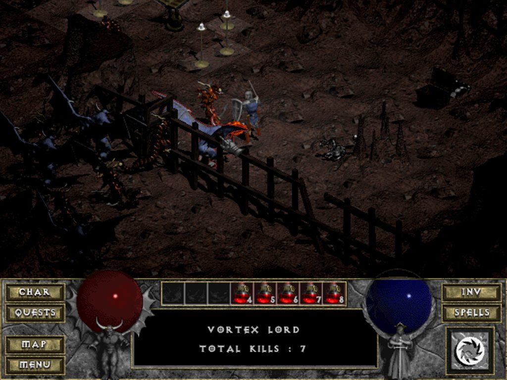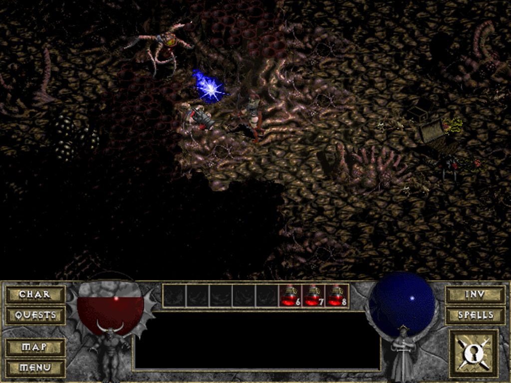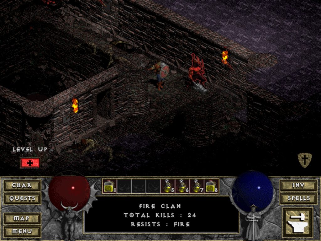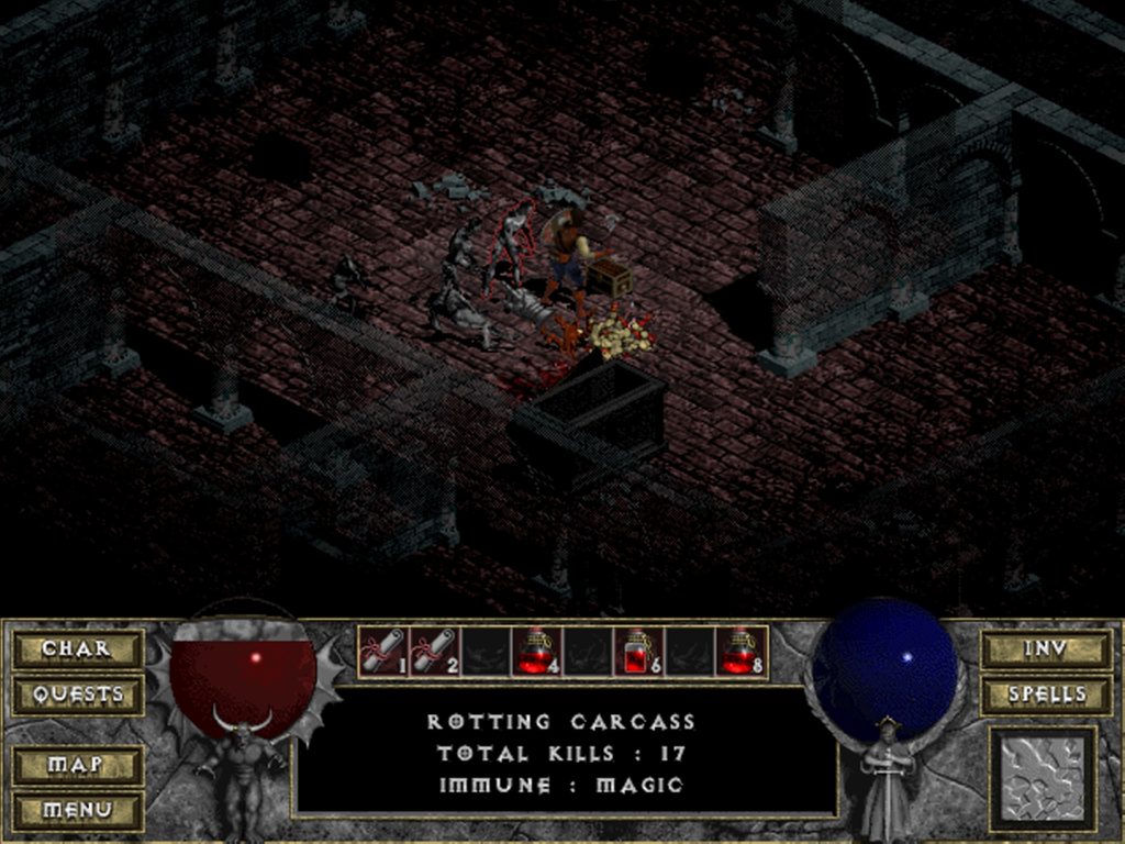 Diablo can be considered a dungeon crawler. The dungeon beneath the cathedral consists of sixteen floors and each one is designed to be more difficult than the last. One of the most unique features of the game is the randomization. Every time you start a new game, the dungeon floor layouts, quests, and loot are randomized as is some of the enemies that appear. This adds a lot of replay value to the game because no playthrough will ever feel the same. Loot is a big part of the game. It’s what makes the experience fun and addictive. Slaying monsters and finding new toys to play with. The toys being loot. Loot is basically all the items in the game. Gold, weapons, armor, jewelry, potions, elixirs, spells, scrolls and if playing Hellfire; oils and runes. Loot can be found in the environments and enemies will often drop loot when defeated.