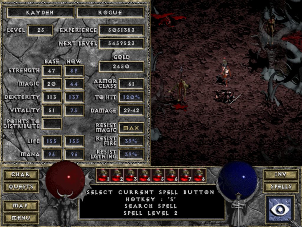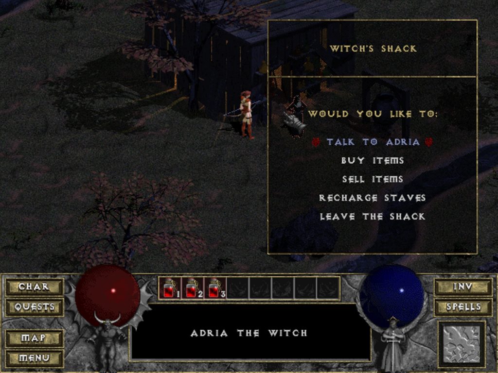 The game’s formula is pretty simple. Slay monsters, earn experience, level up, equip better gear, rinse and repeat until you defeat Diablo. As you slay monsters, you earn experience and when you earn enough, you level up and are awarded points that can be spent to improve your character’s stats or attributes. While character building isn’t as deep as that of the sequel, it is important to know the strengths and weaknesses of each class and allocate points appropriately. There’s all kinds of weapons and armor that you can find and equip and spellbooks that can be read to learn new spells. Items like these will require your character to have a certain amount of points in certain attributes before they can be equipped or read. Whenever you take damage, you lose health and whenever you cast a spell, it drains your mana. These can be replenished by potions and even by things like shrines found in the environments. Health can also be replenished by the healer in town.