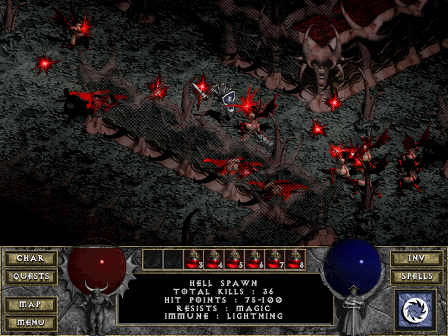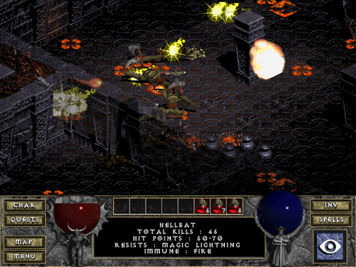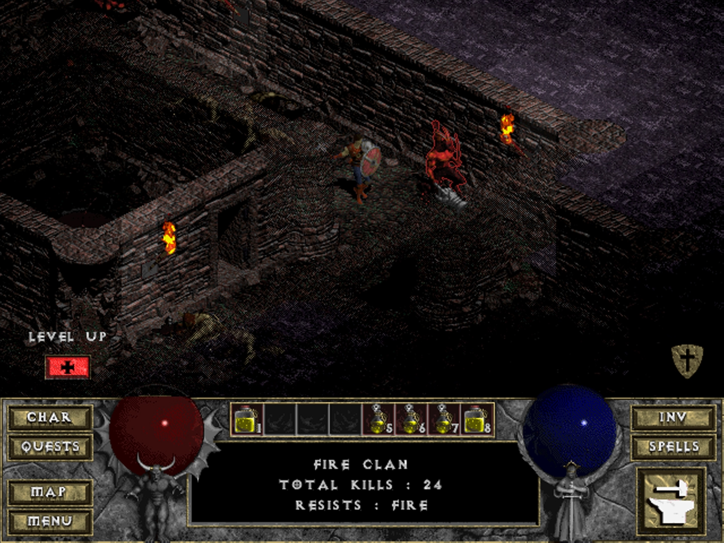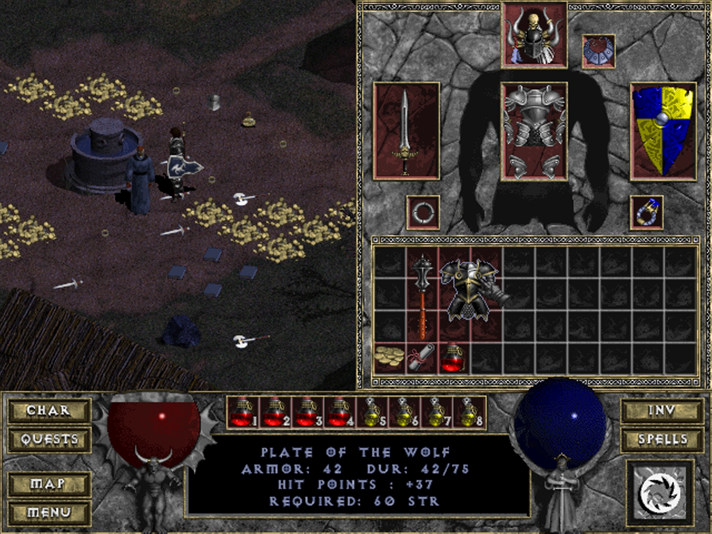 Diablo can be considered a dungeon crawler. The dungeon beneath the cathedral consists of sixteen floors and each one is designed to be more difficult than the last. One of the most unique features of the game is the randomization. Every time you start a new game, the dungeon floor layouts, quests, and loot are randomized as is some of the enemies that appear. This adds a lot of replay value to the game because no playthrough will ever feel the same. Loot is a big part of the game. It’s what makes the experience fun and addictive. Slaying monsters and finding new toys to play with. The toys being loot. Loot is basically all the items in the game. Gold, weapons, armor, jewelry, potions, elixirs, spells, scrolls and if playing Hellfire; oils and runes. Loot can be found in the environments and enemies will often drop loot when defeated.