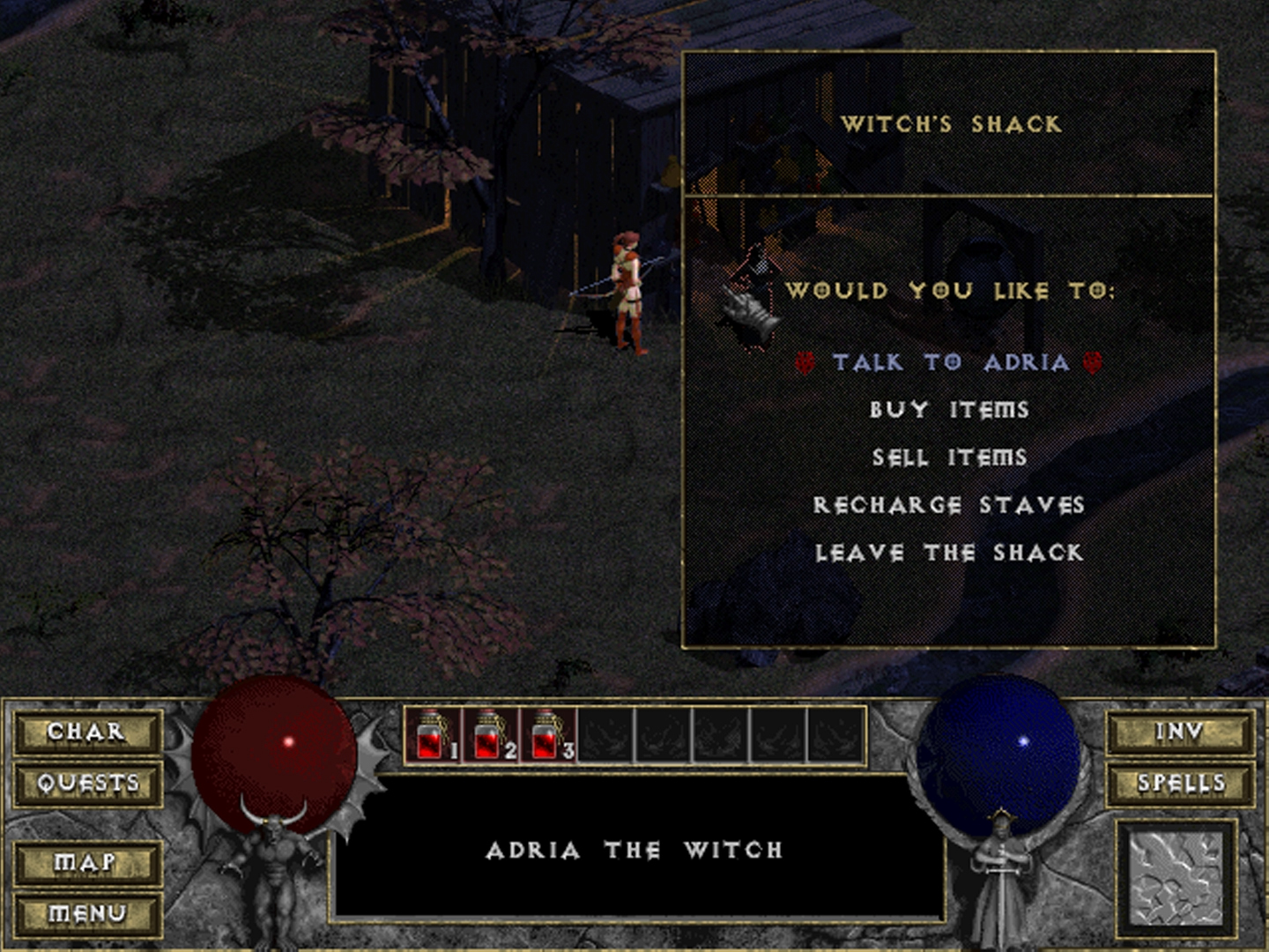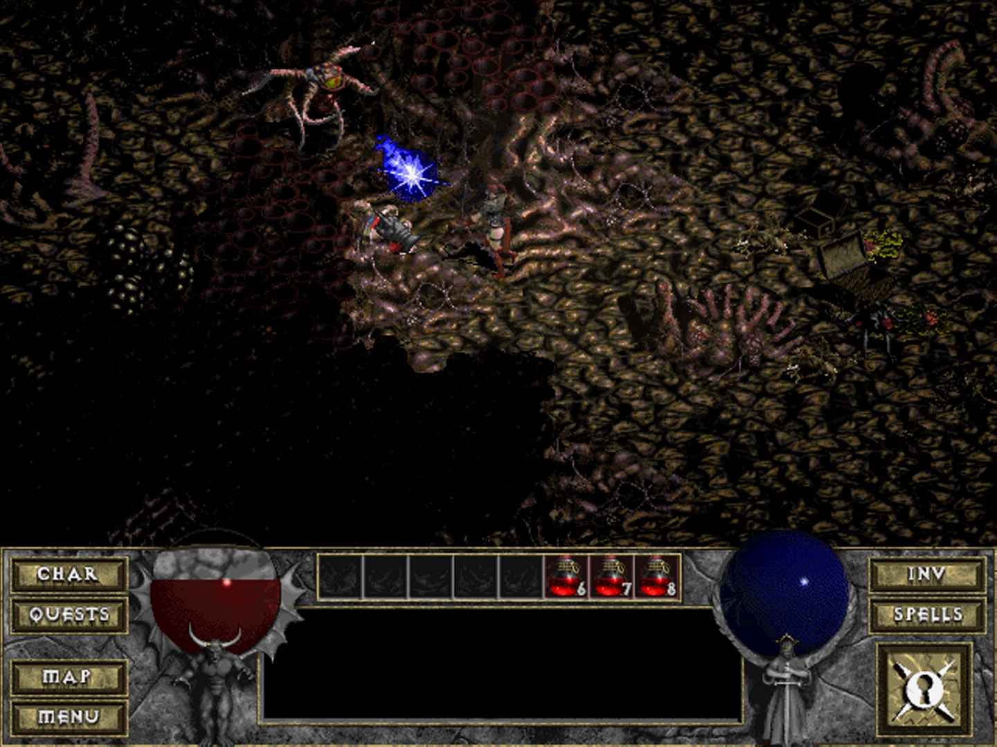 The game’s formula is pretty simple. Slay monsters, earn experience, level up, equip better gear, rinse and repeat until you defeat Diablo. As you slay monsters, you earn experience and when you earn enough, you level up and are awarded points that can be spent to improve your character’s stats or attributes. While character building isn’t as deep as that of the sequel, it is important to know the strengths and weaknesses of each class and allocate points appropriately. There’s all kinds of weapons and armor that you can find and equip and spellbooks that can be read to learn new spells. Items like these will require your character to have a certain amount of points in certain attributes before they can be equipped or read. Whenever you take damage, you lose health and whenever you cast a spell, it drains your mana. These can be replenished by potions and even by things like shrines found in the environments. Health can also be replenished by the healer in town.
