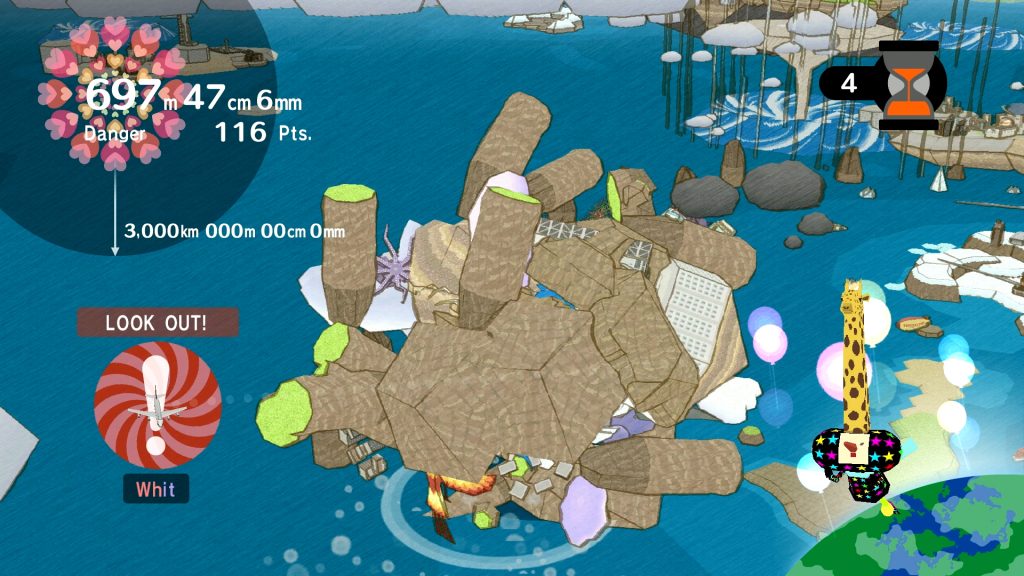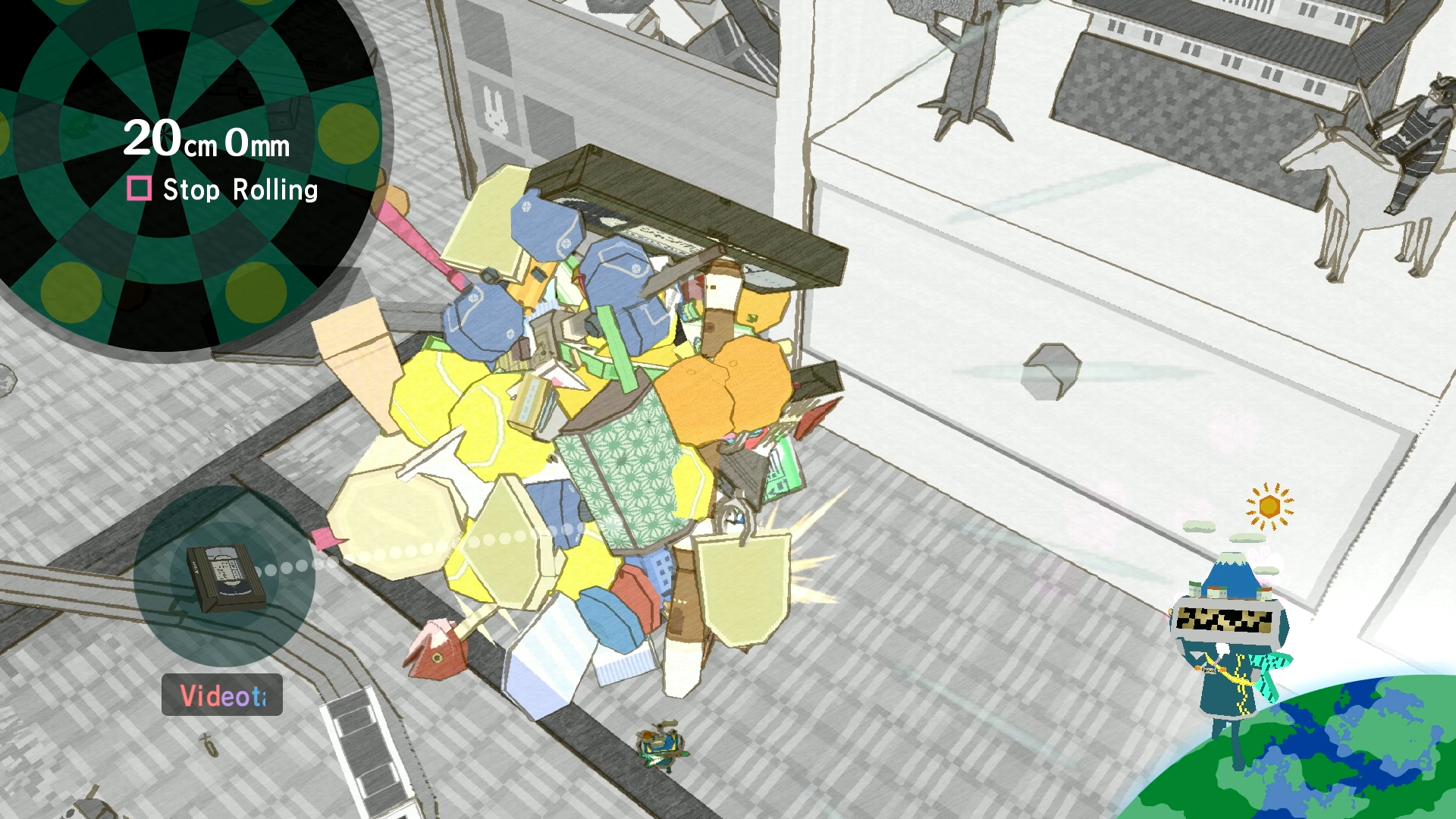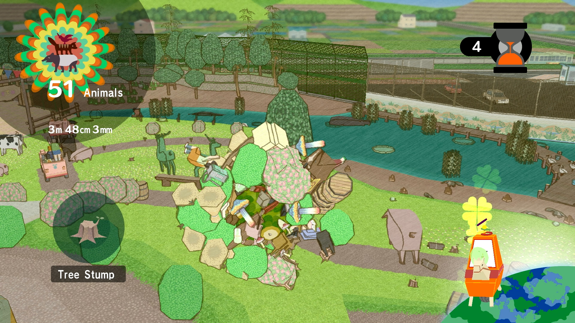 Just like the previous games, you take control of the Prince or one of his cousins and push Katamaris around the stages. Each stage offers an objective to complete and you can earn points based on your performance and/or what you roll up. Getting through all the stages isn’t all that difficult but, in my opinion, earning one hundred or more points in each one and in each game mode is one of the most challenging aspects of the game. The Village Square acts as the hub area in this entry and this is where you can access your collection, change cousins, equip accessories, and access the stages. Cousins are unlocked by rolling them up in the stages and you can also find and roll up presents which unlock accessories to equip the characters with. All the items you roll up are added to your collection and I do consider Katamari Forever to be a collect-a-thon.