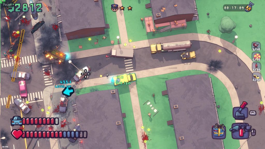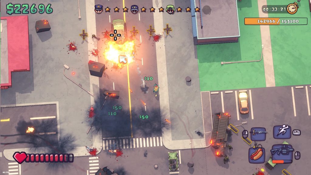 Maniac showcases a colorful presentation with cool visual effects. I really enjoy the blood splatter and explosions. The city is destructible and any destruction remains for the duration of the run. Everything from destroyed barriers to buildings turned to rubble remain and it’s pretty cool to navigate around and see the result of all the carnage. The action is backed by some funky music and characters will often shout humorous one-liners during gameplay. The sound effects are alright and get the job done but I did notice certain sounds would often get cut off when there was lot going on. On the technical side, I did not encounter any major issues.