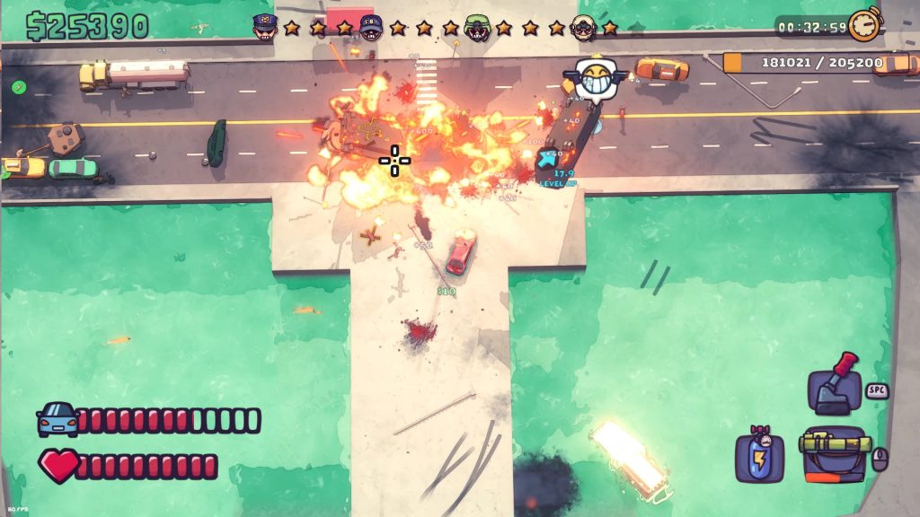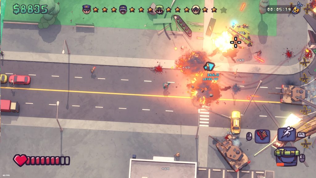 Don’t get me wrong, Maniac is a fun game but I don’t think it offers the same kind of addictive quality as games like Vampire Survivors mainly because of the way it handles upgrades and weapons. As a result, it does start to get repetitive quickly. Granted, survivor style games can also get repetitive but the build variety is what keeps you coming back. At least I think so. In Maniac, you run around killing people and destroying things for money and most of the variety lies with the different characters and their weapons and abilities. Regardless, the different weapons, equipment, and abilities are fun to experiment with, the action is fun and shooting people and blowing stuff is satisfying. Blood splatters, explosions look cool, and you can even bring down buildings. It’s the kind of game that’s fun to mess around in and the longer you survive, the tougher things get. Authorities will be coming from everywhere, projectiles will be flying every which way, and explosions become commonplace. The city, itself, is basically a big playground ripe for destruction. You can hijack or steal any vehicles you see, including aircraft. Everything from motorcycles to taxis to trucks to helicopters to weaponized vehicles like tanks are all for the taking. You can do whatever you want and go wherever you want. Maniac is a game that gives you plenty of freedom.