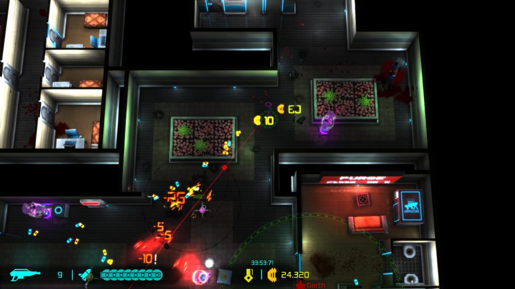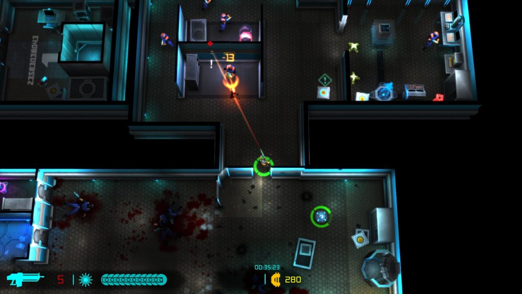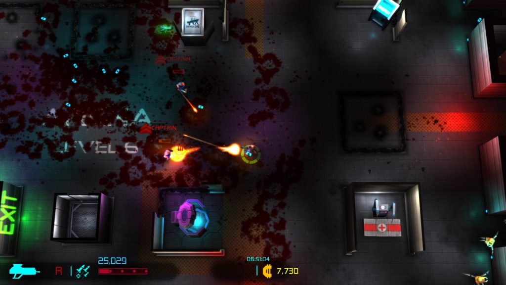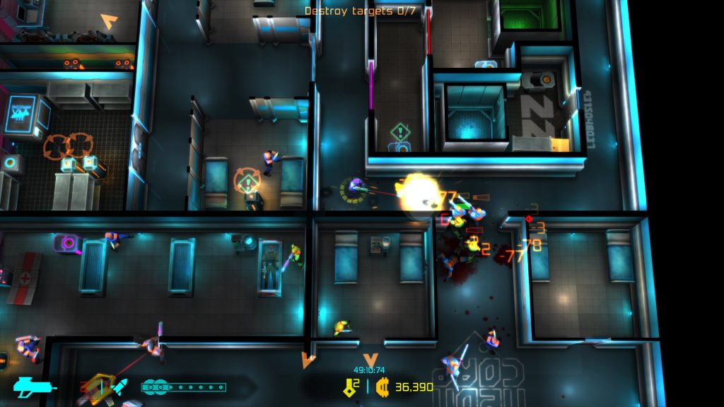 Neon Chrome showcases a colorful visual presentation. Living up to it’s namesake, it’s full of bright neon colors, conveying a neat cyberpunk aesthetic. The action and zoomed out top down perspective kind of hides the fact that the character models aren’t anything spectacular but the visual and gore effects accompanying the action look good and help make the combat feel exciting and satisfying. The levels are split up into different floor types or locations including labs, offices, warehouses, residential, and medical and make for decent visual variety. The action is accompanied by solid audio work and tunes that are a nice fit for the theme. On the technical side, the game ran smooth and I encountered no major issues.