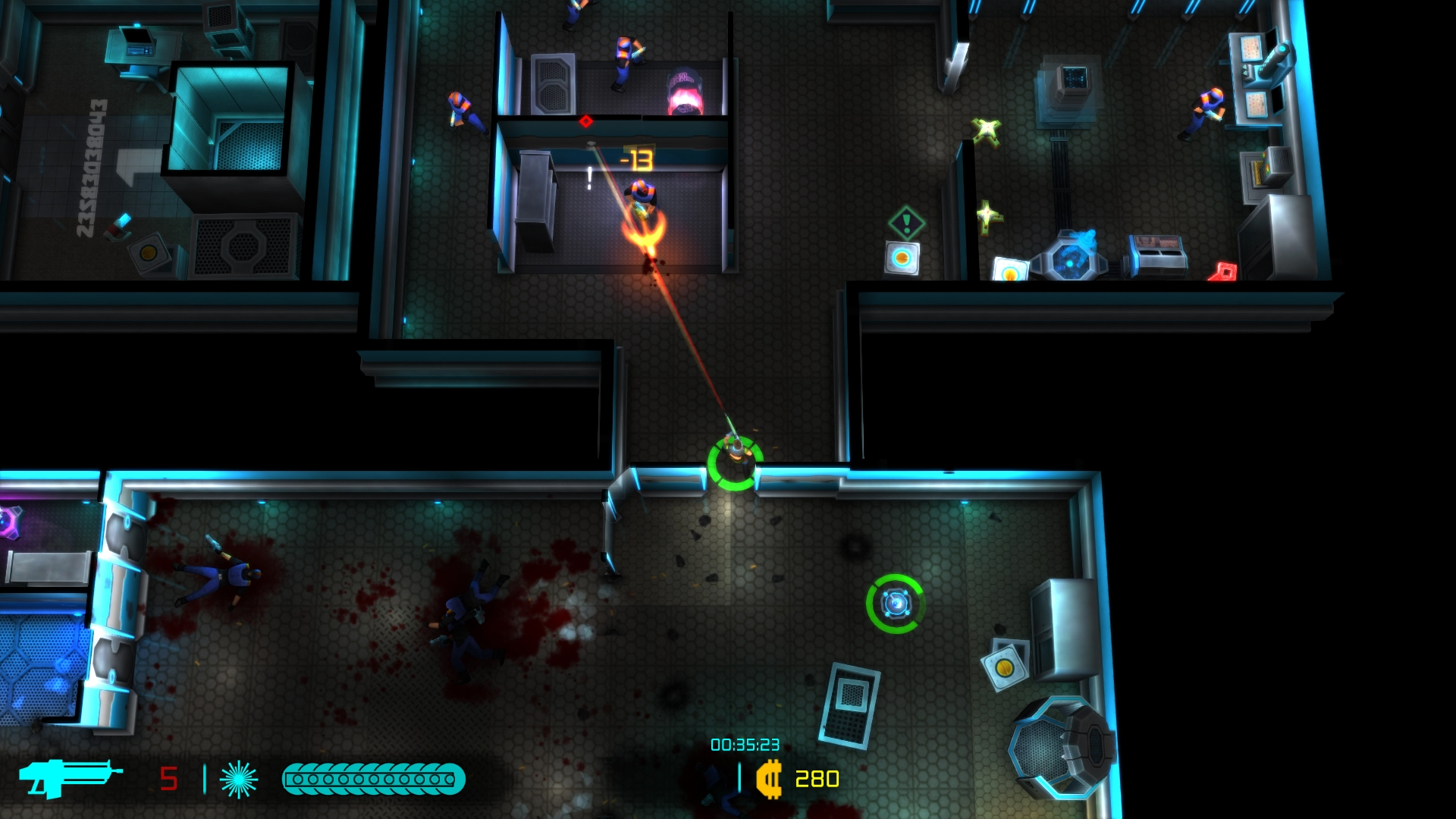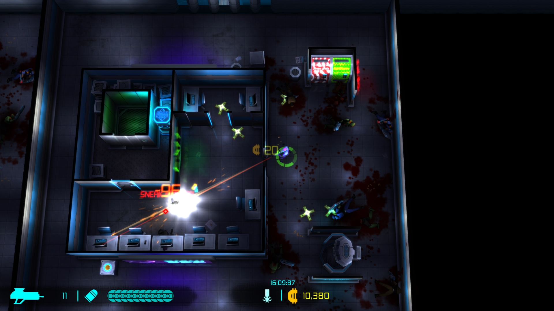 Neon Chrome showcases a colorful visual presentation. Living up to it’s namesake, it’s full of bright neon colors, conveying a neat cyberpunk aesthetic. The action and zoomed out top down perspective kind of hides the fact that the character models aren’t anything spectacular but the visual and gore effects accompanying the action look good and help make the combat feel exciting and satisfying. The levels are split up into different floor types or locations including labs, offices, warehouses, residential, and medical and make for decent visual variety. The action is accompanied by solid audio work and tunes that are a nice fit for the theme. On the technical side, the game ran smooth and I encountered no major issues.