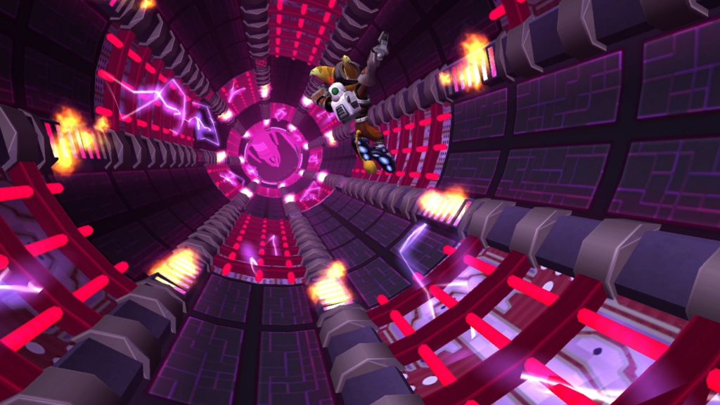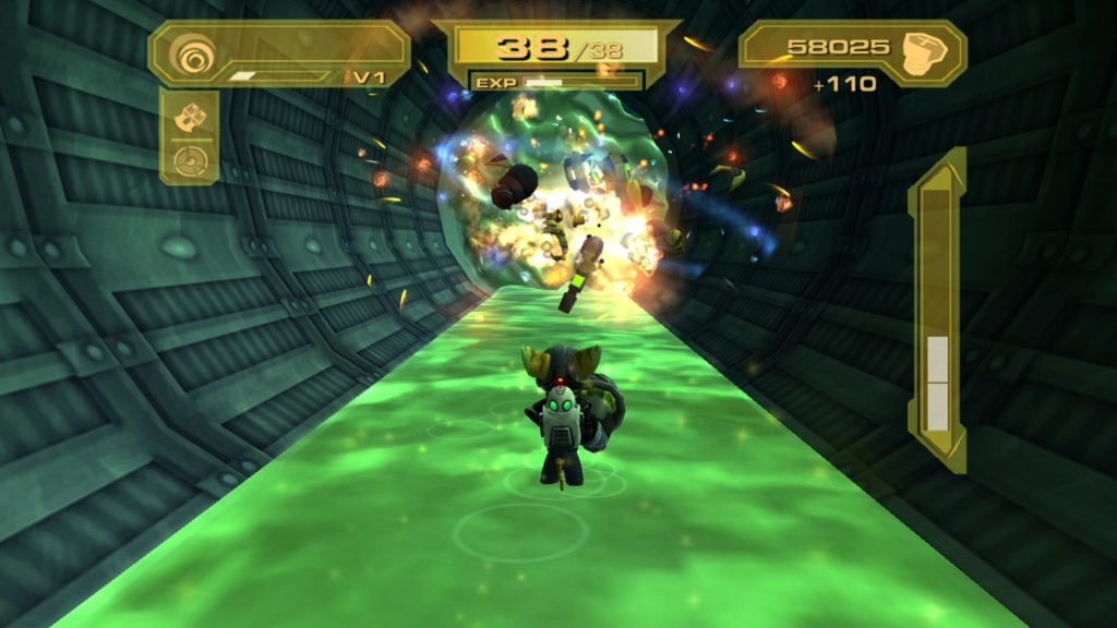 The Starship Phoenix acts as a hub area of sorts. This is where you will receive mission briefings, can view any trophies you’ve collected, access vendors, train in combat scenarios, and play vid-comics. The vid-comics are sidescrollers where you play as Qwark and shoot enemies and collect tokens. These comic episodes actually make up a storyline supposedly detailing Qwark’s defeat of Dr. Nefarious. Like Going Commando, Up Your Arsenal gives you plenty of ways to earn bolts which is good because you’ll need them to buy the various weapons and armor that become available as you progress. There isn’t as many what I’ll call “bolt farming zones” as there was in the previous game but you can participate in Deathcourses and fight waves of enemies in a battle arena for bolts and other prizes. Titanium Bolts are hidden around the planets and act not only as collectibles but also a special form of currency that can be spent to unlock skins.