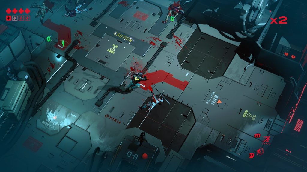 Ruiner comes with an excellent variety of weapons that are fun to use and a cool set of gadgets and trying them all out is all part of the fun. From multi-dashing to slowing down time to hacking enemies to fight for you – all prove to be pretty useful. Enemies come in different types and wield different weapons and the combat is fast-paced and can be very hectic and intense. With you and enemies dashing around, projectiles zipping around everywhere, and explosive objects littered about, a lot can happen during during a battle so you’ll want to stay alert and utilize your gadgets to overcome the challenges. The combat looks and feels fantastically brutal. The visual and gore effects are excellent. Muzzle flashes look cool, blood will splatter, and enemies can be burnt, frozen, electrocuted, and blown up, and their bodies will ragdoll. The protagonist can also perform Ruiner kills on downed enemies which are violent finishers and they all look awesome.