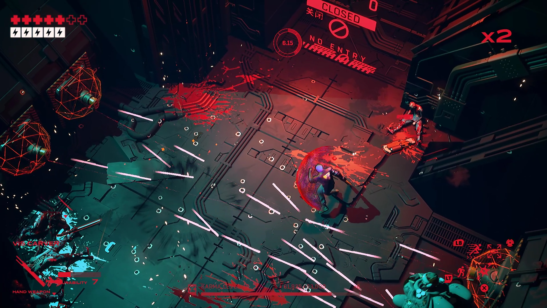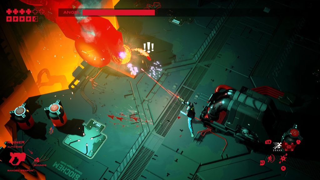 Ruiner is one of those games that kept nagging me. I would frequently see it on Steam and thought it looked cool so I eventually bought it, probably during a sale. This was years ago and I haven’t played it because I’ve been busy with other games. Yet, it still shows up for me on storefronts like it’s just nagging me to play it. So I decided it was time. Developed by Reikon Games and published by Devolver Digital, Ruiner was released for PC, Xbox One, and PlayStation 4 in September, 2017, and Switch in June, 2020. For this review, I played the PC version. Ruiner is a twin-stick shooter with a cyberpunk theme. I like twin-stick shooters, I like cyberpunk, and I like violence and Ruiner checks off these boxes.