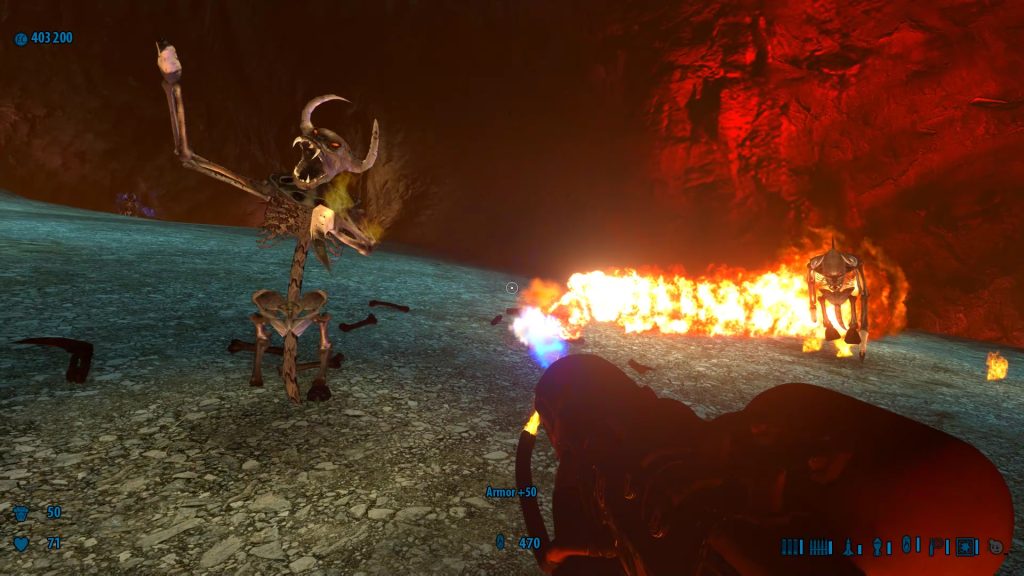 The Second Encounter does come with a multiplayer component and the campaign can be played solo or cooperatively. Before really getting into the nitty gritty, I want to mention again that the gameplay is basically identical to that of its predecessor. The game even runs on the same engine. That said, this review will not tread on much of the same ground. The HD remake looks a lot better and is mostly faithful and everything I liked and disliked about The First Encounter applies here. The fun, fast-paced and intense gameplay, decimating armies of foes, impressively large environments and draw distance, the annoying hitscan nature of Arachnoids, bullshit ambushes – it’s all here. So if you really want to know how I feel about the general gameplay, read our review of The First Encounter. The Second Encounter does feature new weapons and enemies, even larger environments, and it introduces power-ups.