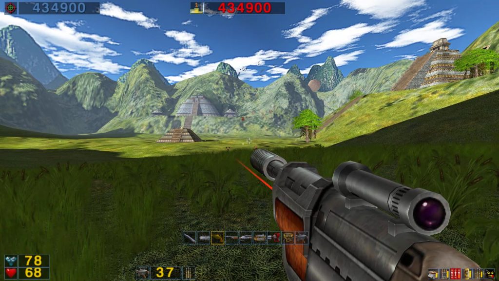 Beginning where The First Encounter left off, Sam is aboard the Sirian spacecraft when it crashes to Earth in the Mayan age. The good news is there is another spacecraft but the bad news is it’s in another time period so the story centers on Sam’s quest to find it. He battles his way through different locations and time periods and plot developments are primarily conveyed through NETRICSA which serves the same purpose as before. Once again, the story is never shoved in your face and the game features a dash of humor and silliness. The Second Encounter is another violent and bloody action-packed shooter but also a bright and colorful experience. Basically, it retains the same type of style, tone and atmosphere of its predecessor. The opening sequence does provide a recap of prior events and while you don’t need to play The First Encounter to understand what’s going on here, The Second Encounter is a continuation and definitely feels like it so I think you may get more out of it if you do.