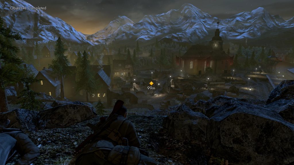 Compared to the previous game, I would say V2 does feel a little faster-paced and better to actually play. Movement feels better and more fluid, searching bodies doesn’t take too long, health regenerates, there’s an automatic checkpoint system, Karl can climb and mantle over things, tag enemies, and there’s an actual cover mechanic. Although, one gripe I have is that Karl can’t snap to certain walls and structures that look like they could be used as cover. It can be a little annoying at times. Sniping is extremely satisfying thanks to the X-Ray Kill Cam. Not only do well placed shots result in a kill cam following your bullet as it travels and hits your target, but you’ll sometimes get to see the bullet tear through the target’s body destroying bones and internal organs. It’s very cool stuff. You can carry a rifle, secondary weapon, and pistol along with dynamite, land mines, grenades, and tripwire grenades. Land mines and tripwire grenades can be used to set up traps and to cover your back while you’re sniping. You can even use land mines to booby trap bodies. Furthermore, before starting a mission, you can access a loadout menu where you can choose what weapons to bring with you.