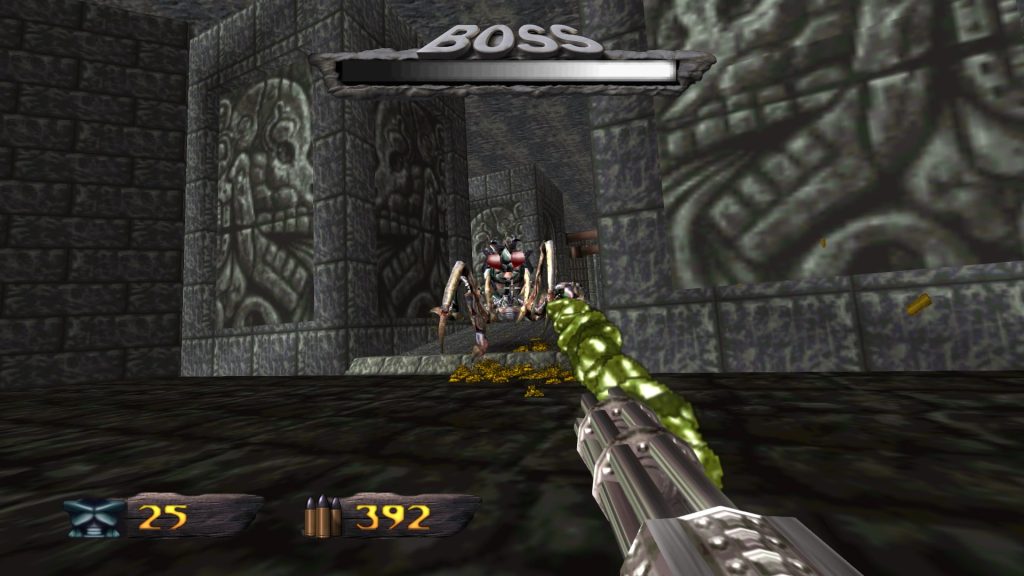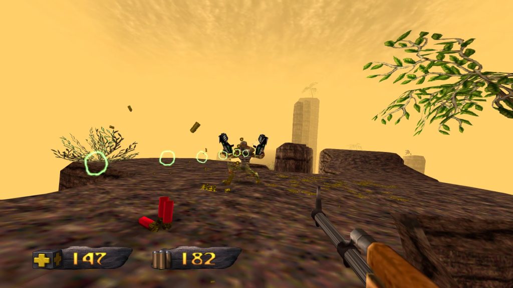 I’ll be honest, I’ve never read the comics and without doing any research, I would have no idea what the plot and lore is from anything I saw during my time with the game. I do have the original 64 game but I don’t have the box or manual so I had to rely on the internet for most plot information. You can easily determine the protagonist is Native American and that there’s going to be dinosaurs just based on the title and what you see upon launching the game but the story here is pretty minimal. As soon as you start playing, you’re told to find the hub ruins and to use keys to open portals to different levels and are then thrown into the gameplay. There’s no NPCs to guide you, no expositions, no inner monologues, and nothing to really inform you of what’s going on in the narrative. But the game is pretty straightforward. You go from level to level looking for keys to unlock new levels and blow away enemies and bosses along the way. What is the protagonist’s backstory? I don’t know. Why are the enemies trying to kill him? I don’t know. What’s their goals and motives? I don’t know. But I do know there are raptors with plasma cannons and Triceratops’ with grenade launchers and miniguns and that’s awesome.