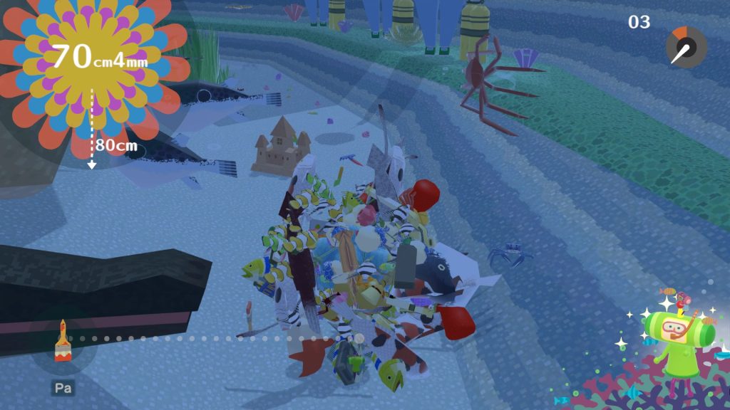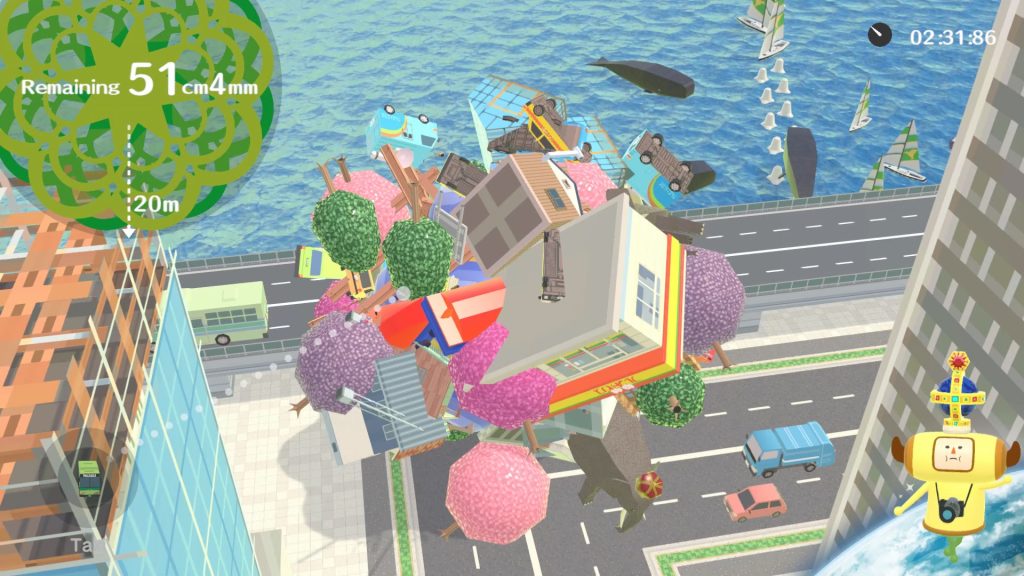 One aspect I feel is an improvement over its predecessor is the variety of environments. You’ll navigate around a house, campground, zoo, school, race track, and some levels will have you rolling up cities. You’ll even get to push the katamari around underwater in one level. As expected, items and objects are littered about everywhere. Almost everything you see can be rolled up. From the people and animals on the ground to the clouds in the sky. While most locations in the game reflect real-world environments, the portrayals of life are far from realistic. You’ll often see people and animals doing humorous and bizarre things, environments simply look messy with random stuff just littered about, and moving objects typically act as hazards. That is until the katamari is big enough to roll them up. The environments are fun to explore. Bumping and crashing into things can result in items flying off the katamari but I can honestly say I had a much easier time avoiding that this time and I’m guessing it’s due to multiple reasons. The refinements being one and another is I played this fresh off the previous game so I was already familiar with the mechanics.