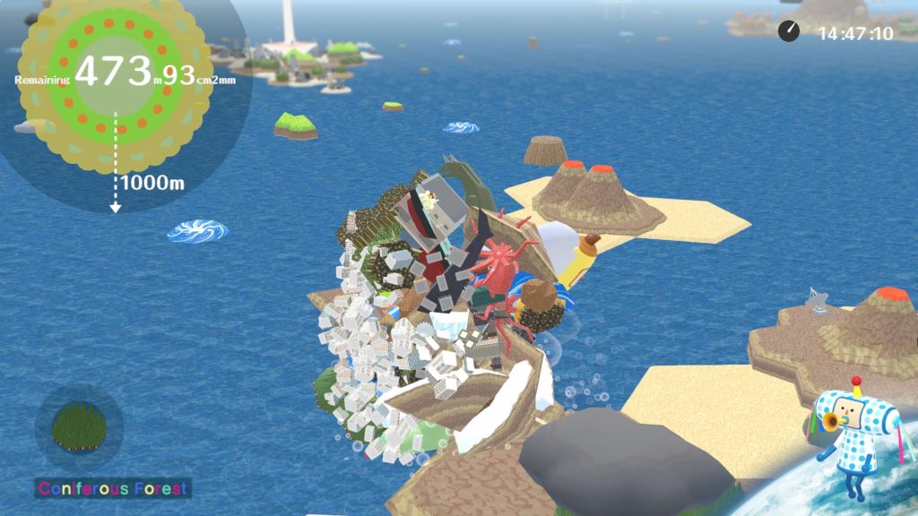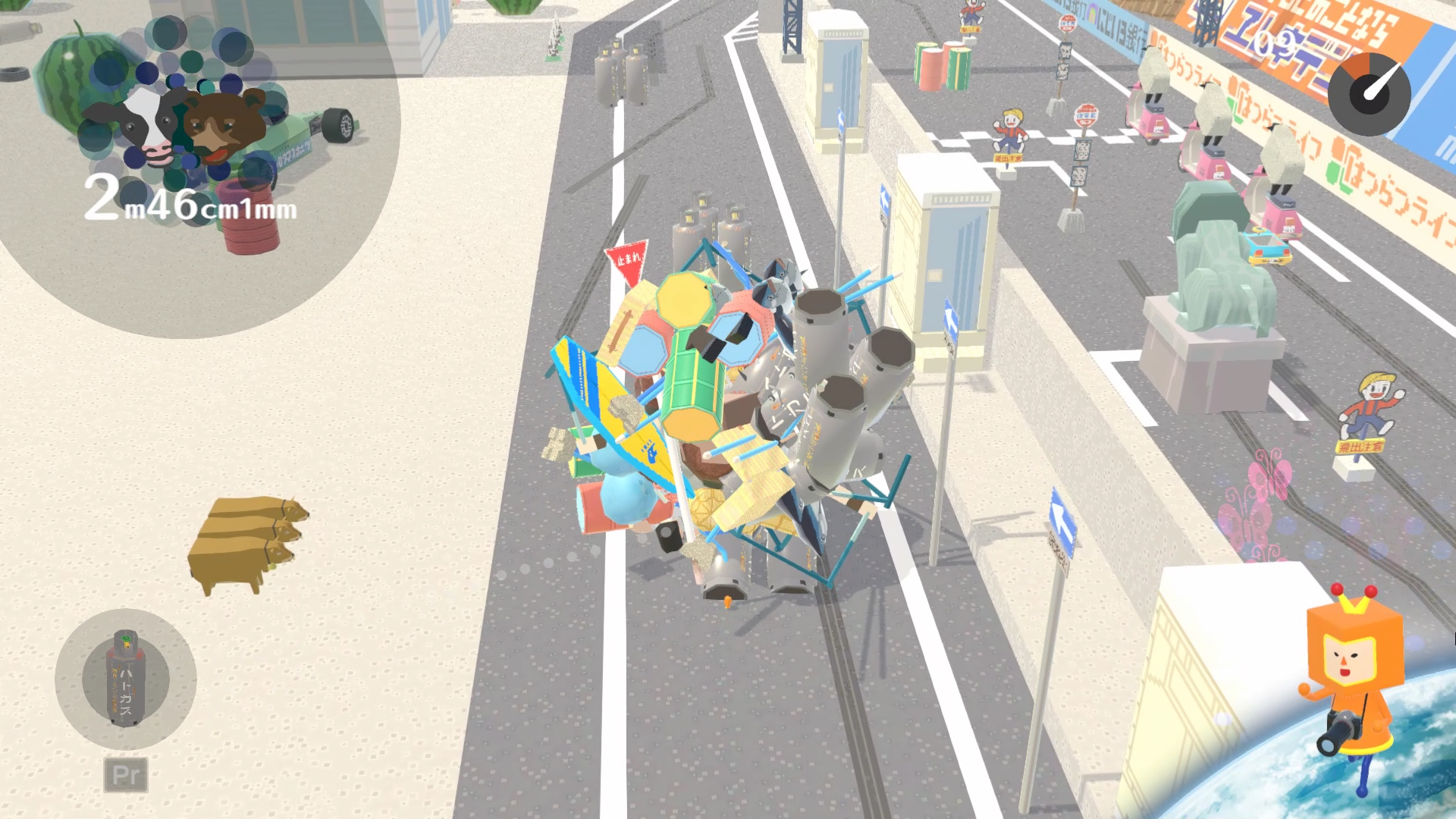 Just like the previous game, I consider We Love Katamari to be a collect-a-thon. Whatever you roll up is added to your collection which you can view from the Select Plaza. Levels will include cousins, presents, and stickers to find. Cousins found in the levels will appear in the Select Plaza where you can choose to play as them. Finding Presents unlocks accessories or cosmetic items that you can equip your character with. Taking photos of stickers you find with the in-game camera will add them to your sticker collection. Needless to say, there’s plenty of things to find and collect. For many levels, the general idea is to grow your katamari as big as possible and most of the time, as fast as possible. Growing the katamari enables you to roll up more things and access new areas and that’s all part of the fun – accessing new areas which in turn allows you to roll up more items. You typically start out by rolling up small items but you can grow it to a size enabling you to roll up massive items like vehicles, buildings, and even land masses among other things.