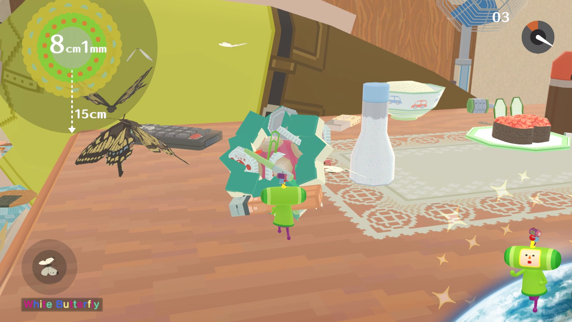 The game features a Select Plaza which is like a hub area. This is where you can save and load your game, interact with Fans, switch cousins, and access your Presents. Fans are basically the game’s levels. A Fan will have one or more wishes or dreams and these are the levels. For several Fans, one level will require you to grow the Katamari as big as possible and the other will require you to grow it to a certain size as fast as possible. Other fans offer more varied goals. For example, one level requires you to clean up a bedroom, another requires you to make the Katamari as bright as possible by rolling up fireflies, and some levels have you pushing wrestlers and growing them bigger than their opponents. There’s a lot more variety to the gameplay compared to what was present in the previous entry. The new content added in REROLL has you playing as a young King and the new levels are remixes of existing ones but they do offer unique challenges in the same vein as the main ones such as finding specific things, rolling up specific things, defeating a boxer, and one level requires you to avoid touching any ghosts.